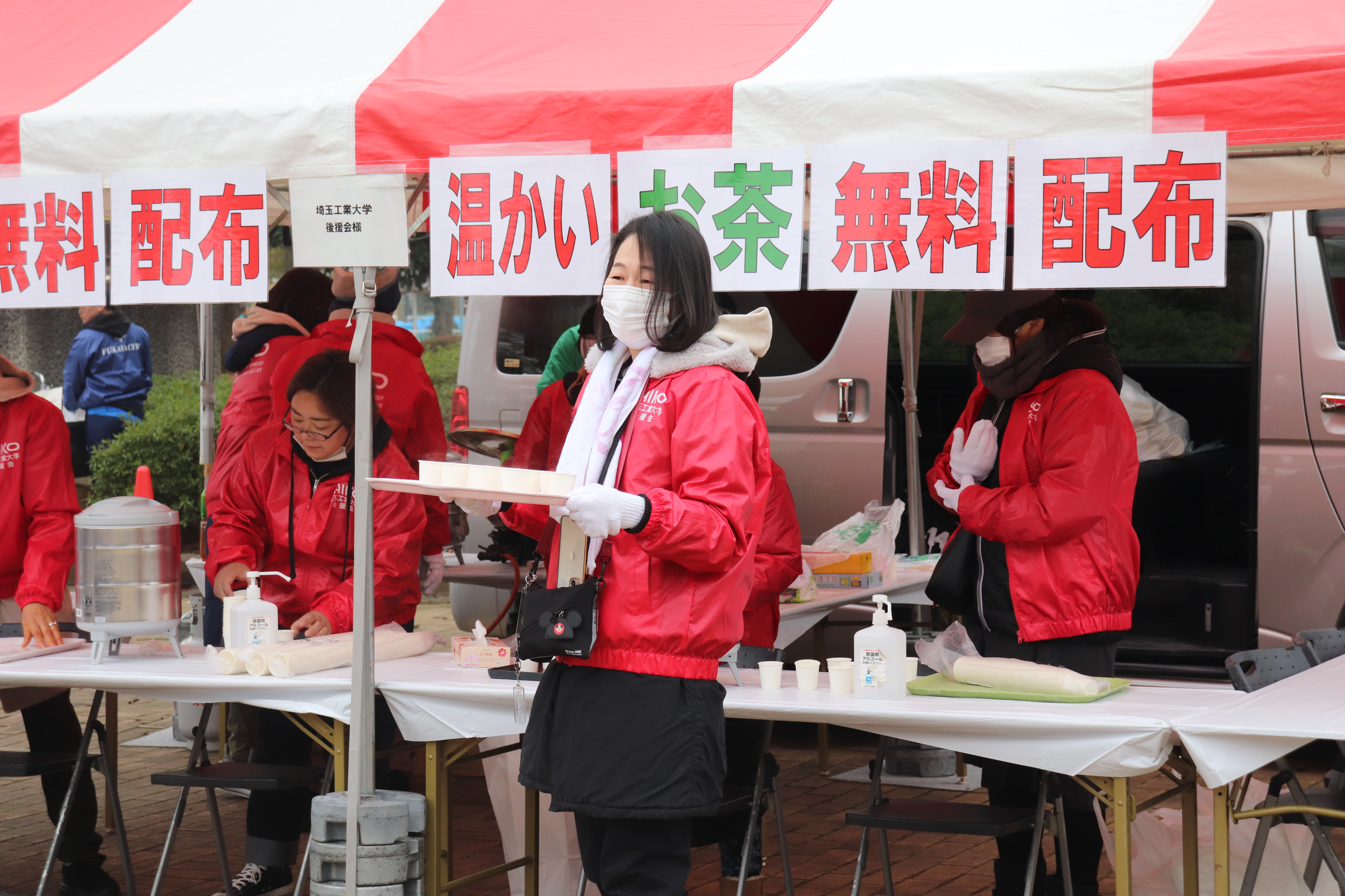 ふかやシティハーフマラソン(お茶出店) ふかやシティハーフマラソンにてお茶を無料配布しました ふかやシティハーフマラソンが、令和6年2月25日(日)に開催され、本学後援会(学生の保護者で組織された会)が、温かいお茶の無料配布を行いました。 当日は気温が低く寒かったため、参加者の皆さんは温かいお茶の提供を大変喜んでくださいました。 後援会の皆さんは、「参加者の皆さんに喜んでもらえて、ふかやシティハーフマラソンに協力できた」と大変喜んでおりました。 ふかやシティハーフマラソンでのひとこま