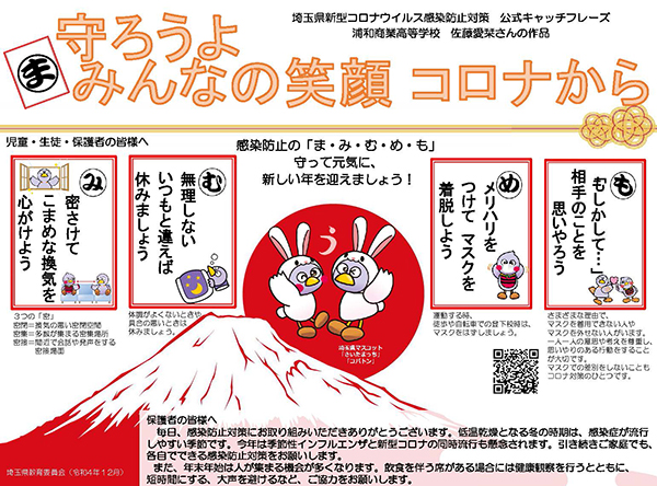 まもなく本学も冬期休業期間(2022年12月28日(水)~2023年1月4日(水))となります。年末年始は外出や人と会う機会も多くなり、つい気が緩みがちとなってしまうことも考えられます。良い年末年始を過ごすためにも、決して油断することなく、引き続き感染拡大防止に努めてください。