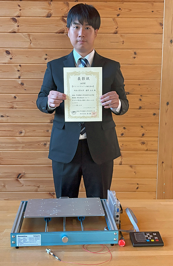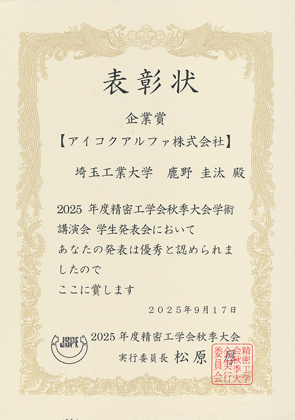 この度、2025年度精密工学会秋季大会の企業賞という素晴らしい賞をいただけたこと、大変光栄に思います。私がこのような賞をいただけたのも、日頃より熱心にご指導くださっている研究室指導教員の長谷亜蘭 准教授のお陰でございます。また、光栄な賞を受け賜りましたアイコクアルファ株式会社様に厚く御礼申し上げます。