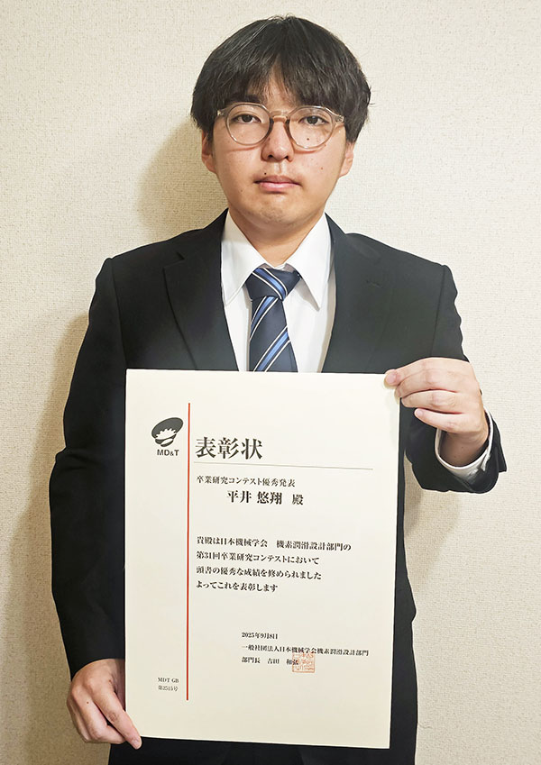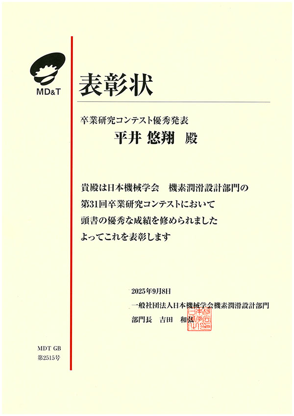 9月7~10日に北海道大学で開催された日本機械学会2025年度年次大会 第31回卒業研究コンテストにおいて、「通電摩耗における水膜介在の影響評価」に関する口頭発表を行い、内容等が高く評価され、機素潤滑設計部門より授与されました。本賞は、産官学より選出された審査員が研究内容、学生の貢献度、発表態度などを総合的に評価し、上位の発表者に授与されるものです。