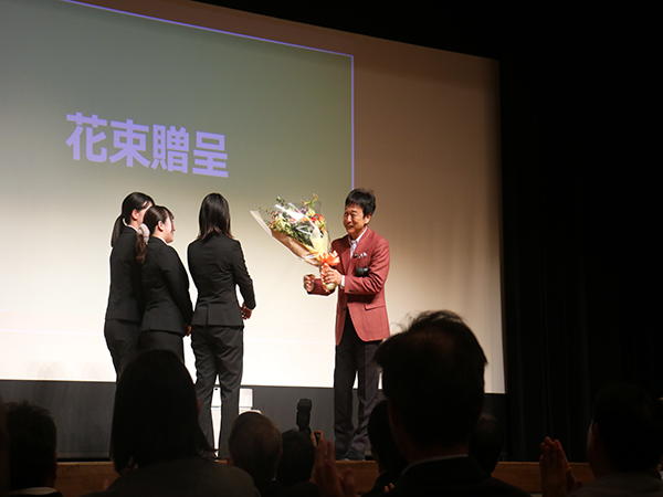 プレゼンテーションが終了後は、太川特命教授への質問コーナーへと続き、来場者、関係者を代表して、太川特命教授へ本学の学生から花束が贈呈されました。