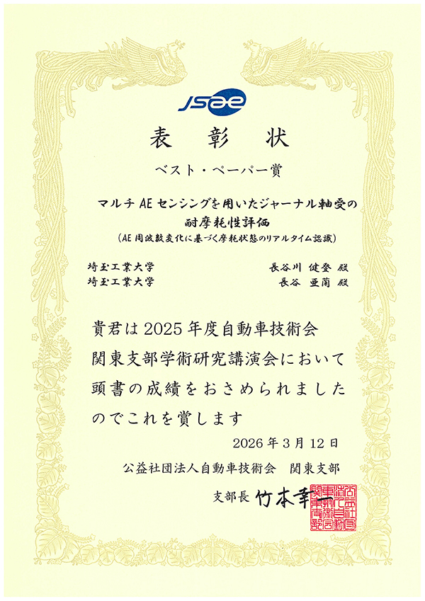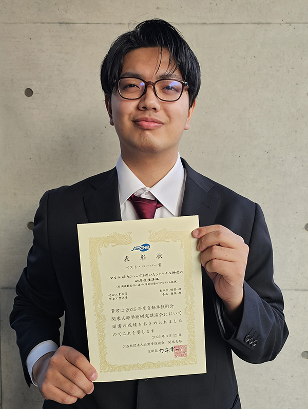 機械工学科と大学院工学研究科の学生らおよび長谷亜蘭 准教授が自動車技術会関東支部2025年度学術研究講演会ベスト・ペーパー賞を受賞!