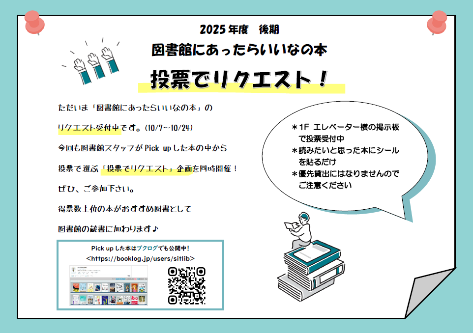 投票でリクエストは、図書館1Fエレベーター横の掲示板にて実施中です。