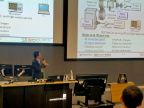 M1の平井さんが「通電摩擦下の水膜厚さによる損耗状態とAE周波数の変化」(右写真),長谷が「回転軸AEセンシングによる転がり疲労損傷のin situ計測・診断」および「AEセンシングを活用した水草のダイナミクスその場計測」について口頭発表を行いました.多くの方々にご質問やコメントをいただくことができました.ありがとうございました.